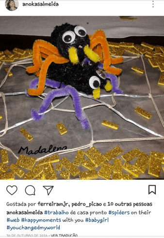 Na creche onde a Madalena estava antes, por esta altura já tínhamos feitos vários trabalhos, lembro-me de um do Halloween era uma aranha e um do dia do pijama onde tínhamos um pijama para devorar. Como é óbvio a aranha era uma aranha menina e o pijama era cor-de-rosa e cheio de lantejolas.